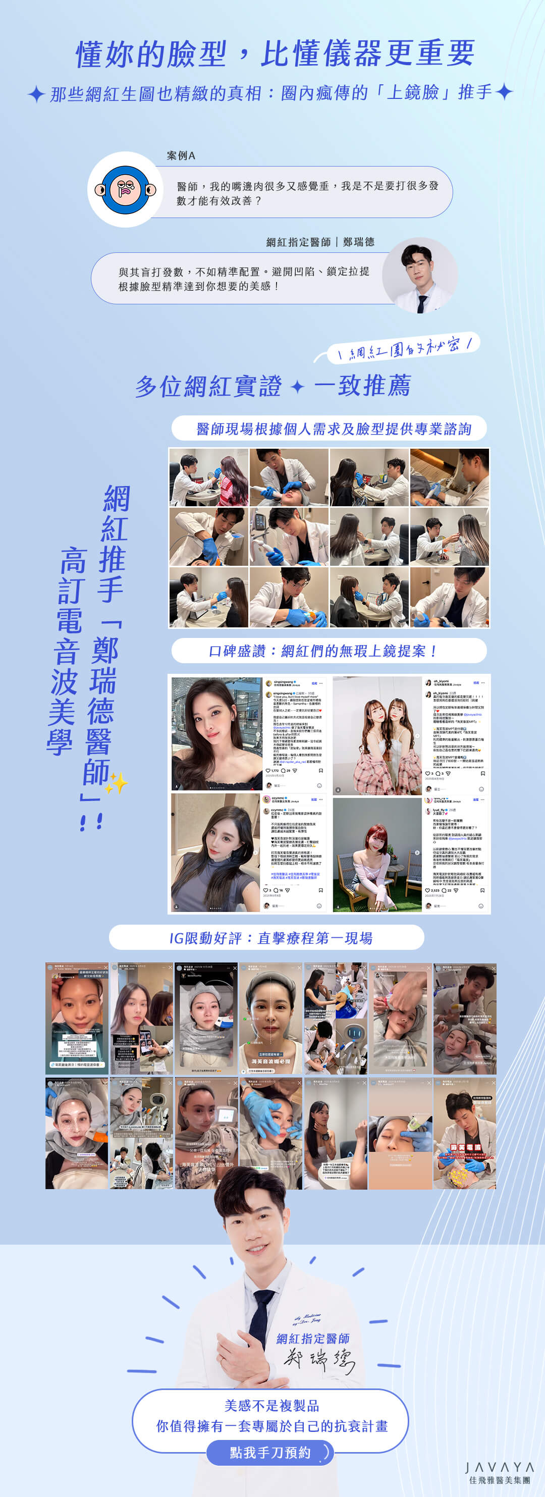 在追求「生圖即美圖」的網紅圈,鄭瑞德醫師是公認的「上鏡推手」。鄭瑞德醫師主張「分層抗衰」,精準鎖定 SMAS 筋膜層、真皮層與皮下脂肪層,依據個人適合的肌膚狀況及想改善的程度,給予不同的電音波儀器施打、探頭、發數推薦,不僅懂儀器原理,更懂臉部動態美感。