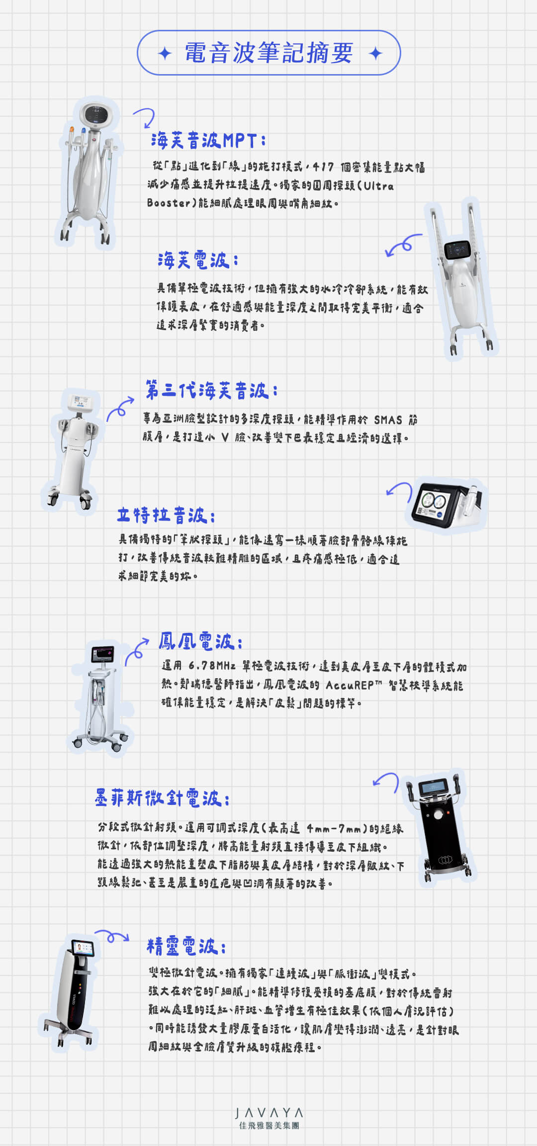 | 針對問題 | 緊緻、全臉除皺 | 極速拉提、V臉 | 深層收緊、頸紋 | 凹洞、毛孔精雕 | 膚質修復、澎潤 | 基礎拉提、消脂 | 眼周、細節拉提 |